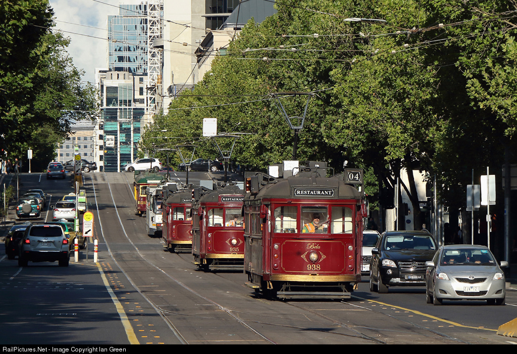 | Restaurant trams 938, 935 and 964 head west along La Trobe Street near Spencer Street on the evening dinner run. |