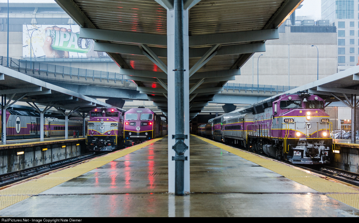 MBTA GP40MC 1133 prepares to depart Boston North Station at 3:10 P.M. December 29, 2015. GP40MC 1138 and HSP46 2023 wait for passengers while still in reverse.