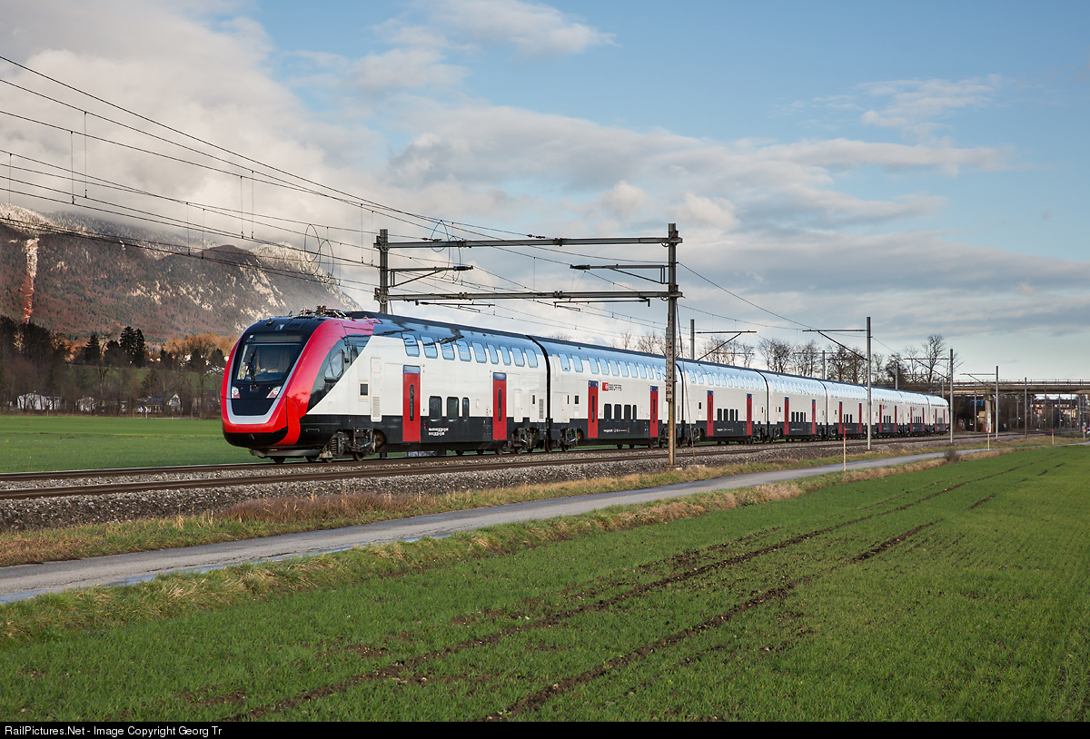 | Test run for pantograph measuring with the new double deck Intercity train "Twindexx Swiss Express" from Bombardier for the SBB, between Solothurn and Grenchen Süd. This is the 200 meter "Interregio" version of the train. There will be built an "Intercity" version with dining car, family compartment and small baggage compartment too (RABDe 502 000). |