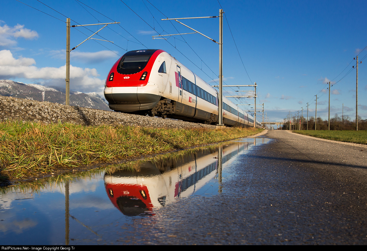 | Intercity tilting train ICN RABDe 500 # 010 "Robert Walser" is running with 160 km/h on the Jurasüdfusslinie (line along the south of the Jura moutain range) between Selzach and Bettlach. |
