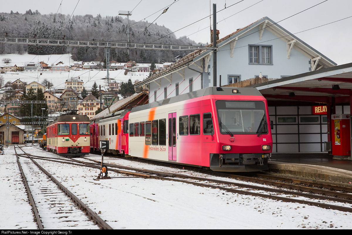 Ste-Croix station on 1066 m a.s.l. with few new snow. On the left the former Be 4/4 # 3 railcar of the YSteC, which was sold to the Bière-Apples-Morges (BAM, now MBC) in 2004 and became # 15 there. Now the railcar is back on the YSteC (Travys) for freight service, because of a rolling stock shortage after a derailment. On the right push pull train with low floor cab car Bt # 55 (Stadler), railcar Be 4/4 # 1 and cab car Bt # 51, ready for departure to Yverdon.