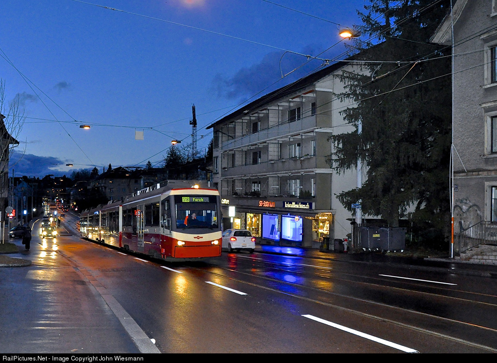 Blue hour time at Zurich: Forchbahn Be 4/6 accelerating for the grade to Rehalp and the hight of Forch.Between Stadelhofen and Rehalp, the Forchbahn trains use the tracks of the tram system, owned by the Verkehrsbetriebe Zürich (VBZ), which are electrified at 600 V DC and are largely situated in the street. Between these two points, Forchbahn trains serve intermediate tram stops at Kreuzplatz (where tram route 15 diverges), Hegibachplatz and Balgrist.[1] At Rehalp tram route 11 has its terminus, and the Forchbahn trains enter the line's separate Rehalp stop. Here they join the Forchbahn proper, which is electrified on the overhead system at 1200 V DC.