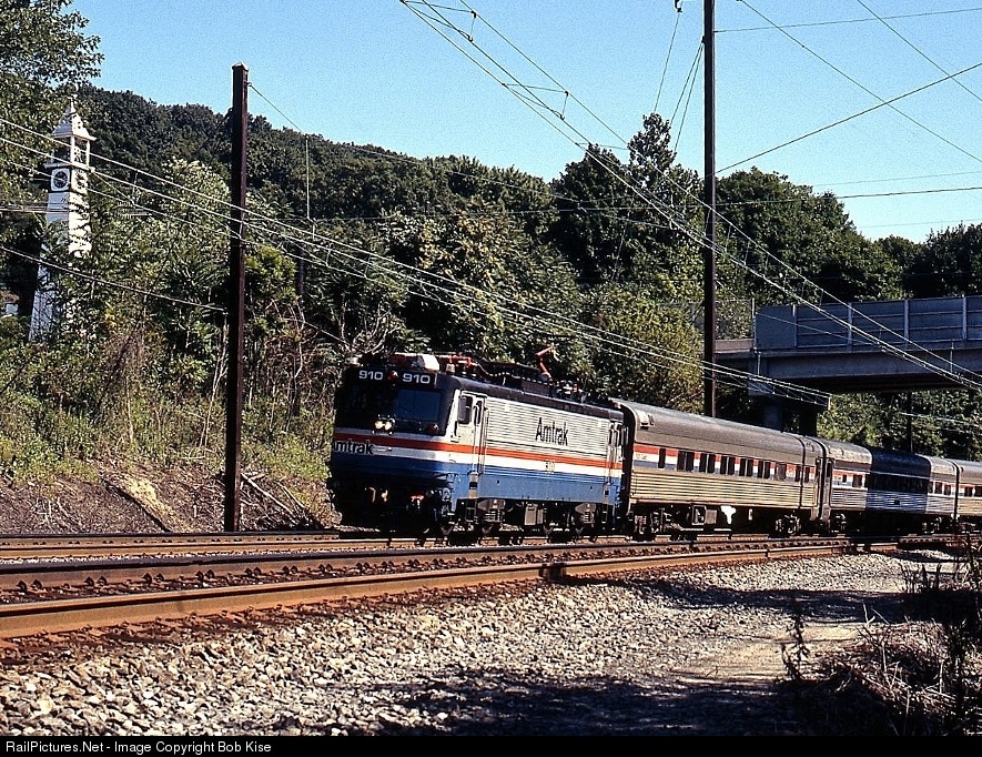 A westbound Keystone Express with Heritage coaches glides by the unique Gap town clock, rounding the big 4-degree curve at 50 mph. The old PRR Main Line passes through Mine Ridge's 560' summit here, heading out of the Chester Valley into the Pequea (Peck-way) Valley. The clock tower was built in 1892 and moved to its current location in 1953.