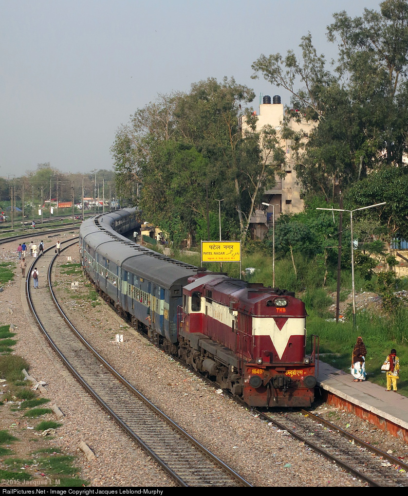 | Tughlakabad-based WDM-3A 16493 pulls into Patel Nagar station, in suburban New Delhi, with an outbound local train to Meerut. |