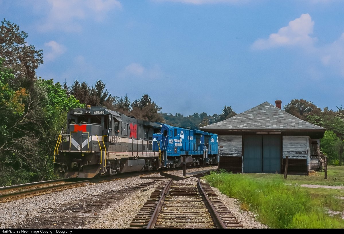 A southbound train of empties passes the Monongahela station at Jefferson, PA. Across the Ten Mile Creek (left and behind the photographer) is the town of Mather, where the Mather Mine, site of the seventh-worst mining disaster in US history, was located. On May 19, 1928, 195 men perished in a gas and coal dust explosion. The mine finally closed in 1965.