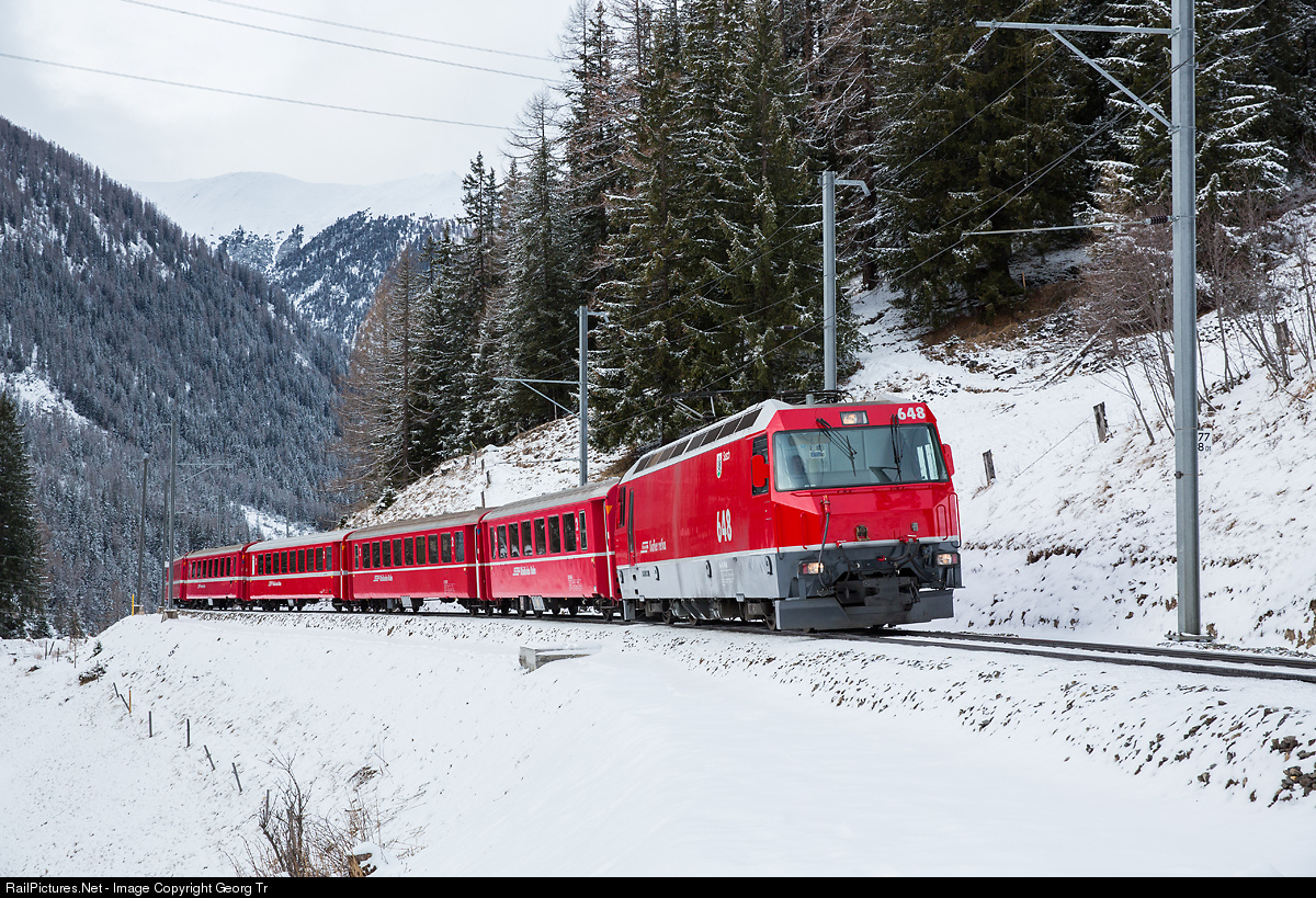 | Finally, Grisons got a few inches of snow! Ge 4/4 III # 648, the only of the series in the beautiful red, with RegioExpress 1141 from Chur to St.Moritz in the Val Tisch above Bergün. |