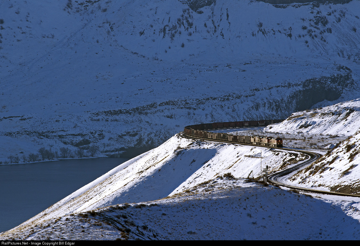 An eastbound empty ballast train grinds up the grade at Cresent Bar, just west of Trinidad siding along the Columbia River in low sunlight and a recent coating of snow. The location is about 25 miles east of Wenatchee, WA.