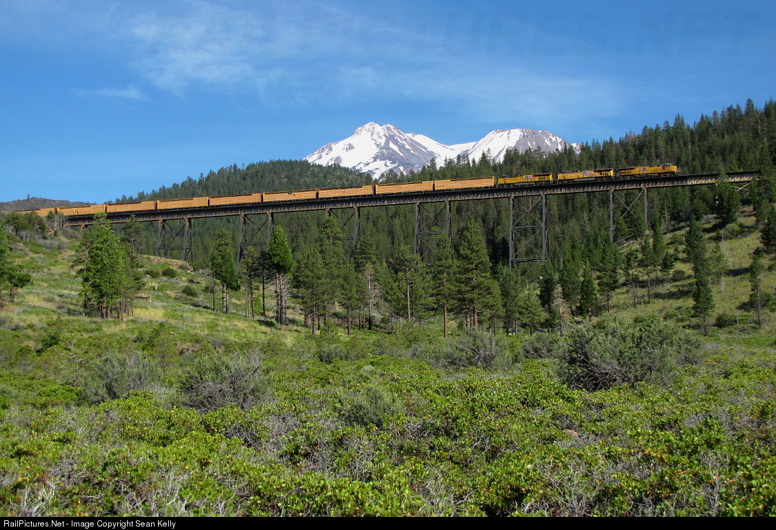 A southbound manifest with a cut of Pacific Northwest lumber on the point rumbles across Dry Canyon Trestle approaching Hotlum with Mount Shasta and Shastina behind.