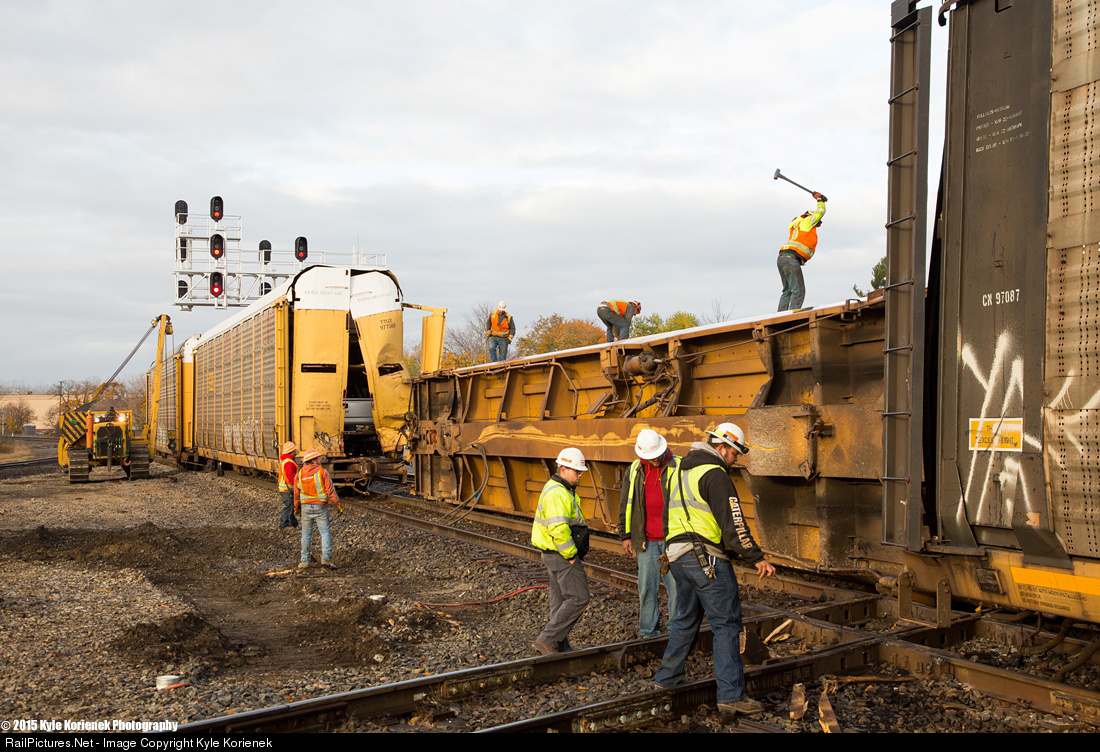 In the early morning hours of October 30th, CN L501 departed Flint South Yard and headed west. While passing through the town of Durand, MI., 14 cars, non-consecutively, derailed, all of which were auto racks loaded with new heavy duty Chevy and GMC pickups from GM Flint Truck Assembly. One car tipped over directly on the diamond, and four more further back rolled and were sideways. Fortunately, no crew members were injured, none of the brand new signal equipment was damaged, and luckily avoided the depot at the diamond. Trains ran somewhat normally, with reroutes going over the Holly and Mount Clemens Subs through Detroit to avoid the derailment. Both mains were cleared and reopened about 24 hours after. While the derailment was bad, and did claim a lot of brand new Chevy and GMC diesel trucks, there was a lot of luck with this derailment considering how bad it could have been.