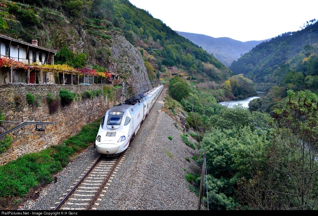 | Dual gauge 730 class (made by Bombardier and Talgo) in a beautiful landscape of Sil River Canyon at Los Peares, between Orense and Monforte de Lemos. |