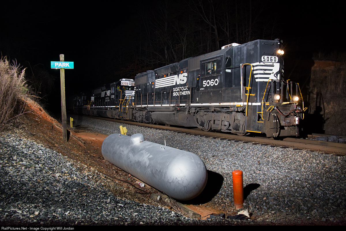| Former Southern high hood GP38-2 5060 leads NS p67 through the CP Park just a few miles north of Toccoa, Georgia on a cold, windy winter night. |