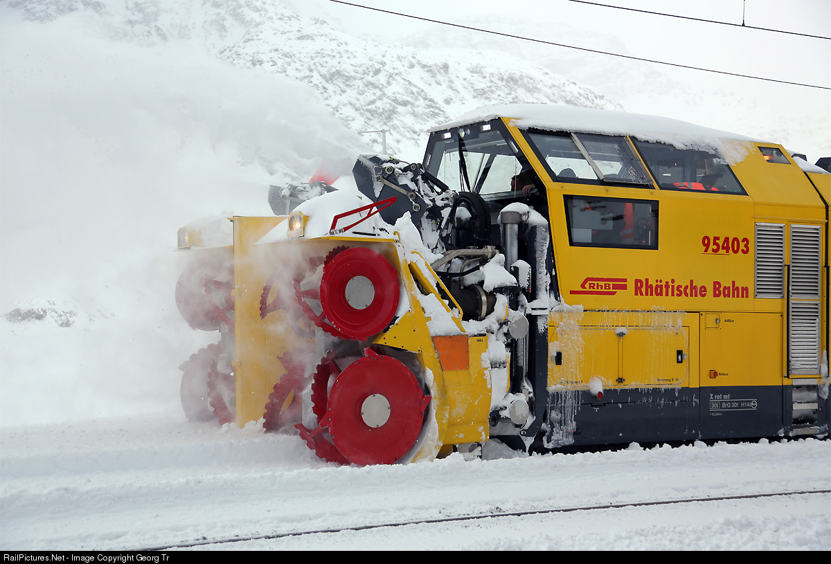 | Snow blower Xrot mt # 95403, built by Zaugg/Eggiswil in 2011, is ploughing the siding track # 3 in Ospizio Bernina. |