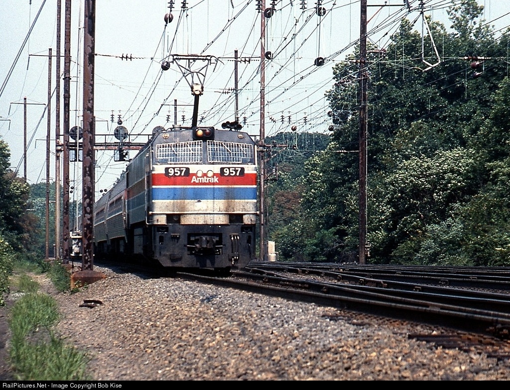The 957 clatters through Oak Interlocking on its way to Washington, DC. No. 957 was built as an E60CH (equipped with head-end power) by General Electric for Amtrak in November, 1975, and was later rebuilt as an E60MA (for "motor-alternator") and renumbered as the 609.