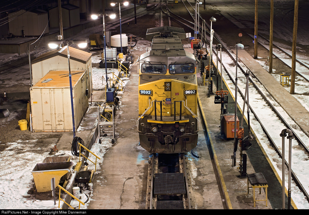| Union Pacific GE C44-9W No. 9692 sits all alone in the diesel servicing tracks at Green River, Wyoming, on the night of January 19, 2013. |
