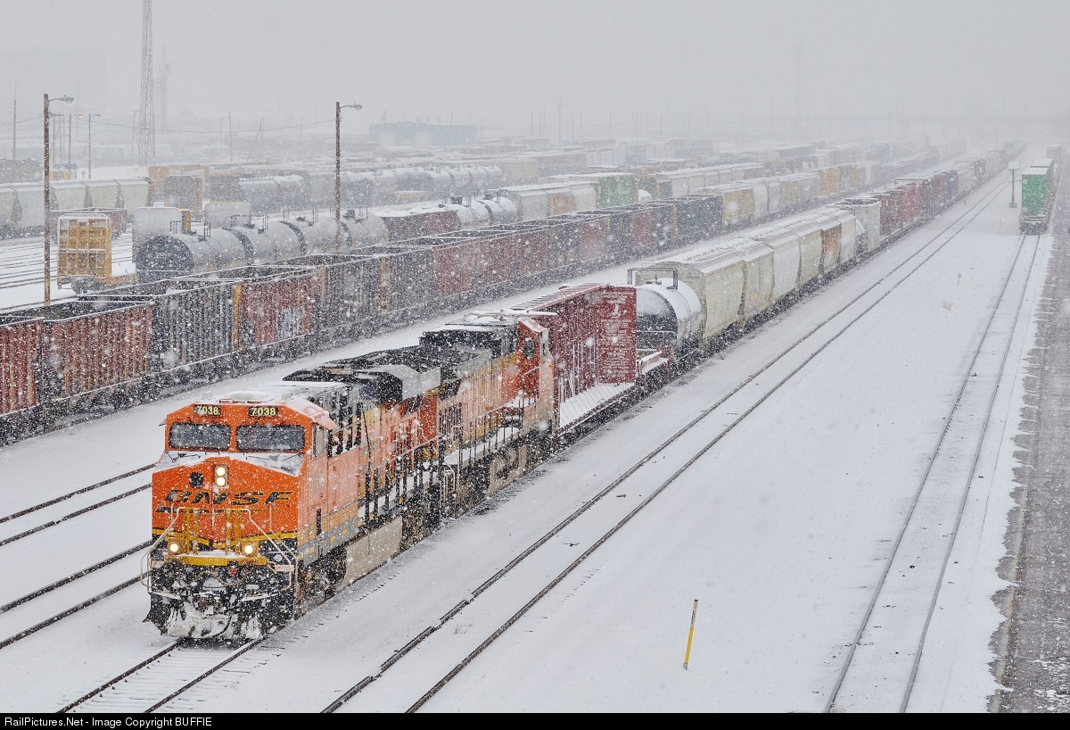 BNSF 7038 (ES44C4) brings a mixed freight passed the UP's North Yard, running through a heavy snow storm on its way to the BNSF's Denver Yard.