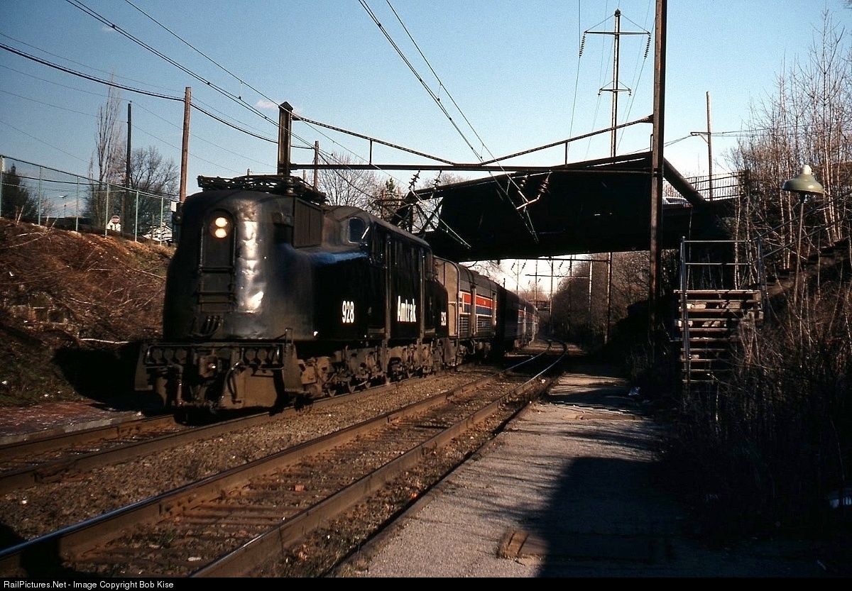 The westbound National Limited is passing under the old Marietta Pike bridge, on its way to Harrisburg for an engine change to diesels. The 1912-built bridge has recently been replaced, but the station platforms are still in similar condition, with only the addition of some plastic bus-stop style weather shelters. The 928 was the 2nd newest GG-1, having been built in April, 1943 by Altoona/Westinghouse as the PRR No. 4937.