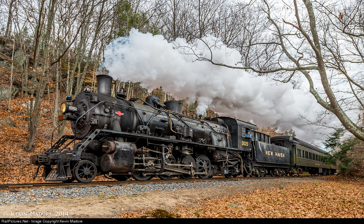 This view provides a pretty good look at the Valley Railroad's Chinese SY, which has been kit-bashed to resemble a New Haven J-1 Class Mikado...a type which has no survivors. The most obvious change is the cab, which is radically different from the one she was built with. The original Chinese Cab was pretty battered in the Knox & Kane engine house fire, and needed to be replaced anyway. The Sunbeam Headlight and number boards are also part of the disguise. The tender has also undergone some serious rebuilding, and now closely resembles the "Clear View" tenders which equipped some of the original New Haven J-1s. Obviously, there are some details which could not be easily changed on this locomotive, but the result is pretty convincing to all but the most serious rail enthusiasts. The only thing that's left to remind the public that his engine was built in 1989, is the red logo of the Tangshen Locomotive Works, which can be seen on the side of the smokebox.