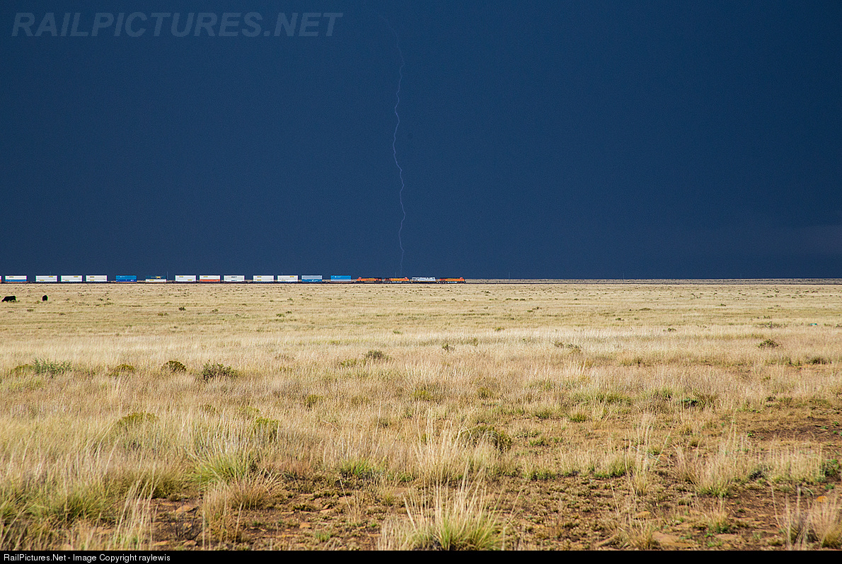 On October 17, 2015 an intense thunderstorm moved through Northern AZ. The lightning had been intense that afternoon, but as the train approached the activity somewhat stopped. As I began snapping photos with the dark sky in the background I missed a pretty large cluster of lightning bolts, but still got lucky as hell to catch the tail end of it striking immediately behind the locomotives out in the wide open desert of Northern AZ. The cows in the foreground were unimpressed by Mother Nature. The shot was taken at Canyon Diablo. The head end is over the famous bridge at this point.