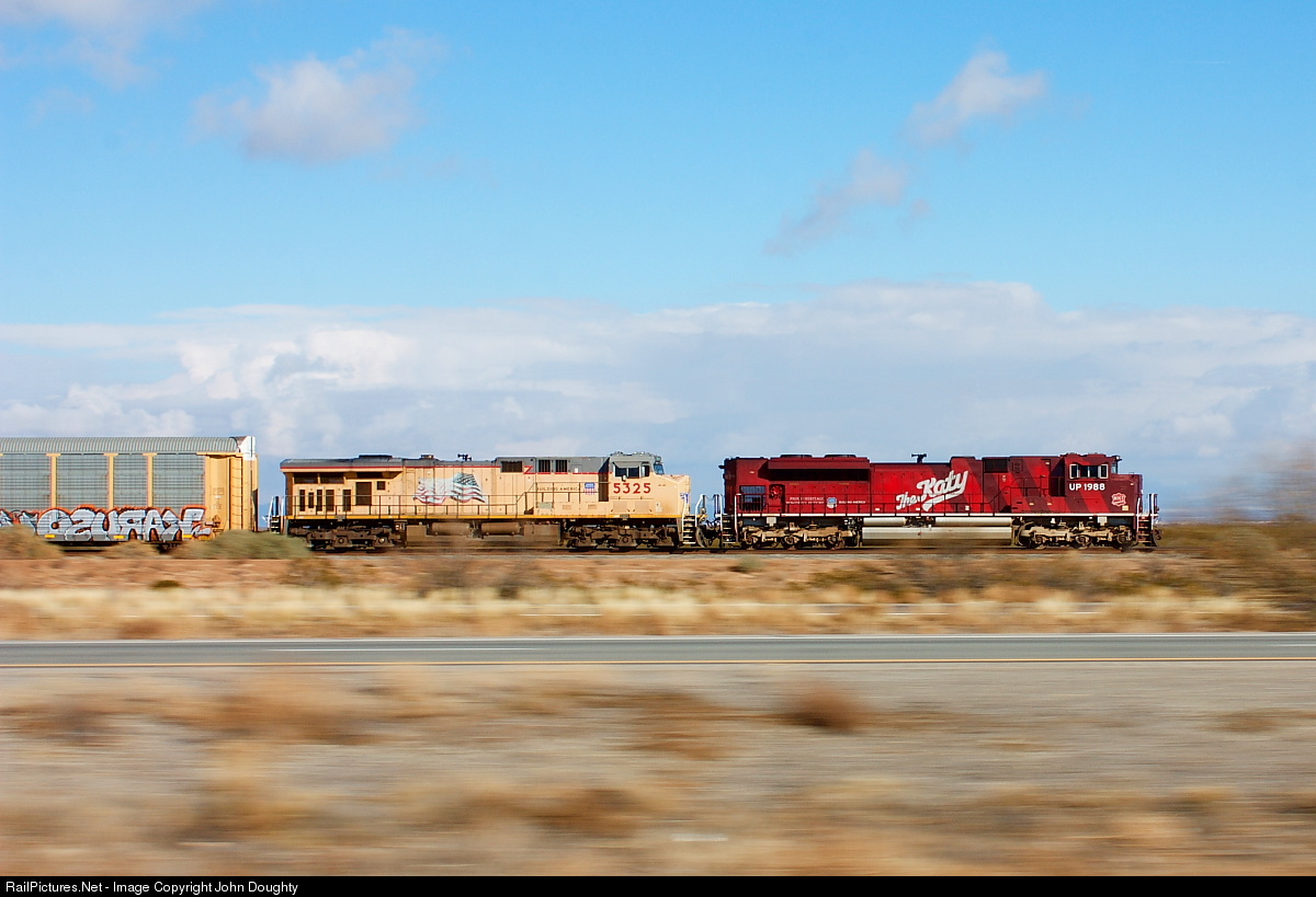 | Union Pacific's MKT Heritage unit UP 1988 leads UP 5325, and an empty autorack train, east through the Arizona desert on a cold, 30 degree morning. |