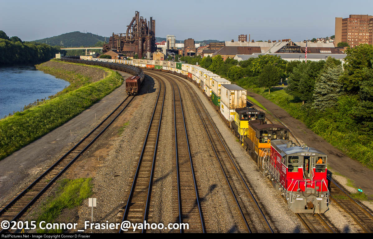 | Lehigh Valley Rail Management brings out a large cut of intermodal cars to be picked up by Norfolk Southern at Bethlehem, PA, with the remains of Bethlehem Steel in the background on a beautiful Summer evening |