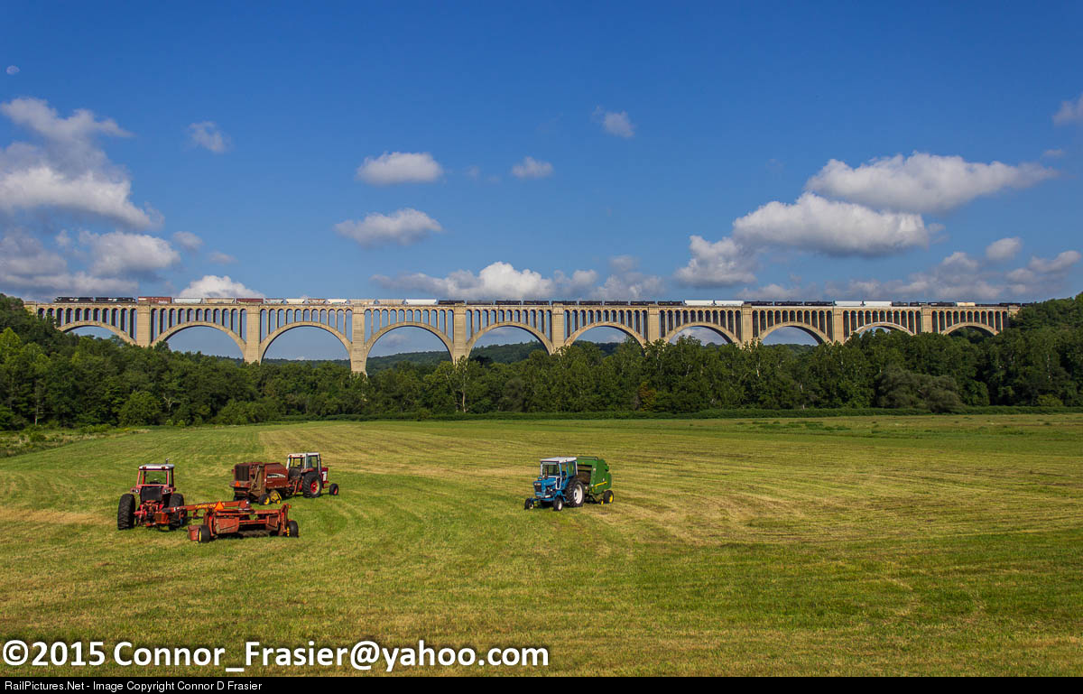 | NS 13T heads west on the CP Sunbury Sub (Now NS) with 1030 leading as it crosses the Tunkhannock Viaduct at Nicholson, PA on a beautiful Summer morning |