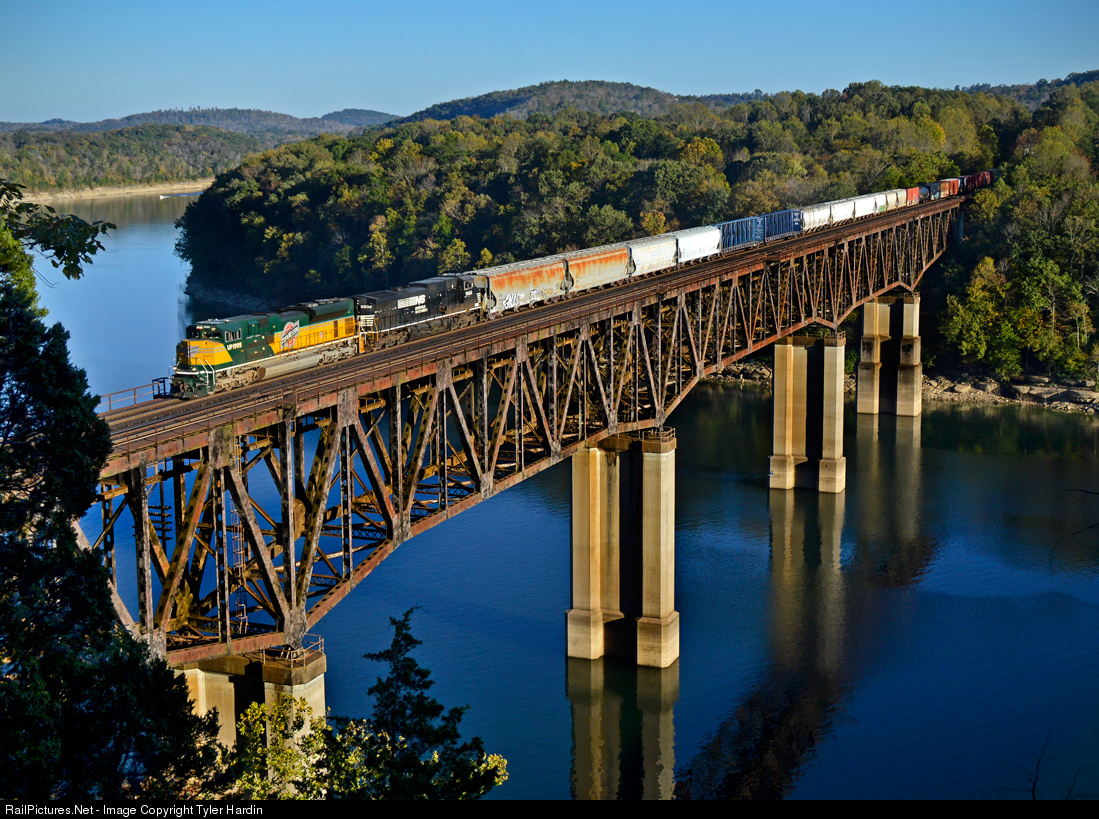 The Chicago & Northwestern Heritage unit does the honors on Cincinnati Bound 142 as it crosses the massive Cumberland River Bridge in Burnside Kentucky.