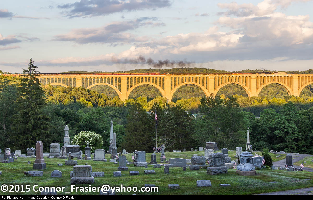 | The Lackawanna heritage unit heads over the former Lackawanna Tunkhannock Viaduct with the NKP 765 and its passenger cars in tow for the 21st Century Steam excursions that took place a few weeks later. |