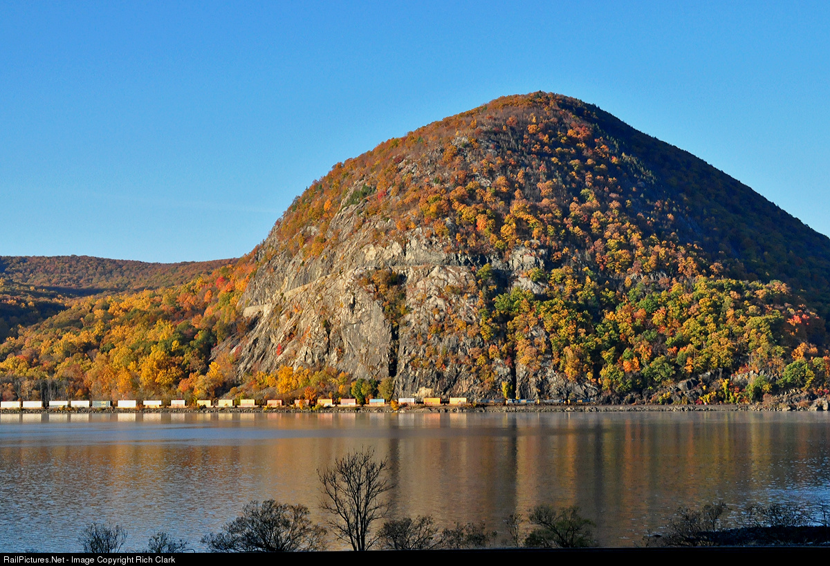 Northbound stacker follows the Hudson River with the lead engine having just passed under a popular railfan cliff spot on Storm King Mountain in the early morning light.