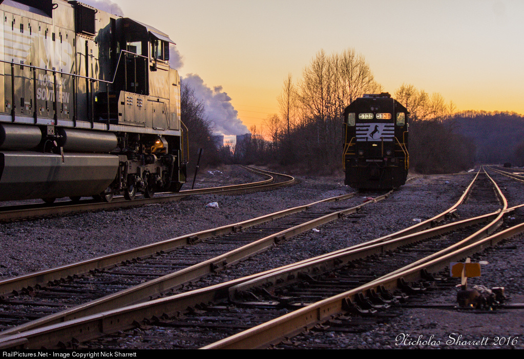 The sun burns it's final light of the day as Norfolk Southern EMD SD70ACe #1059 prepares to continue its trek south towards Dickinson, WV with NS 380. In the background, EMD GP38-2 #5138 idles in a side track. This location is part of the West Virginia Secondary and is scheduled to close in the near future as part of division restructuring. The Gavin and Kyger Creek power generating plants can be seen in the background.