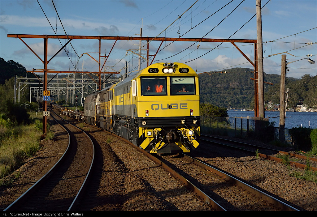 New CSR Ziyang SDA1 model locomotive QBX006 leads NREC/EMD 1105 and dead-attached NoHAB/EMD 1432 across the causeway at Hawkesbury River running as train 4164, a load trial of one of QUBE's QBX Class. The trial entailed testing QBX006's haulage capabilities on the 8.6-kilometre, 2.5% Cowan Bank grade between Hawkesbury River and Cowan Station, north of Sydney.