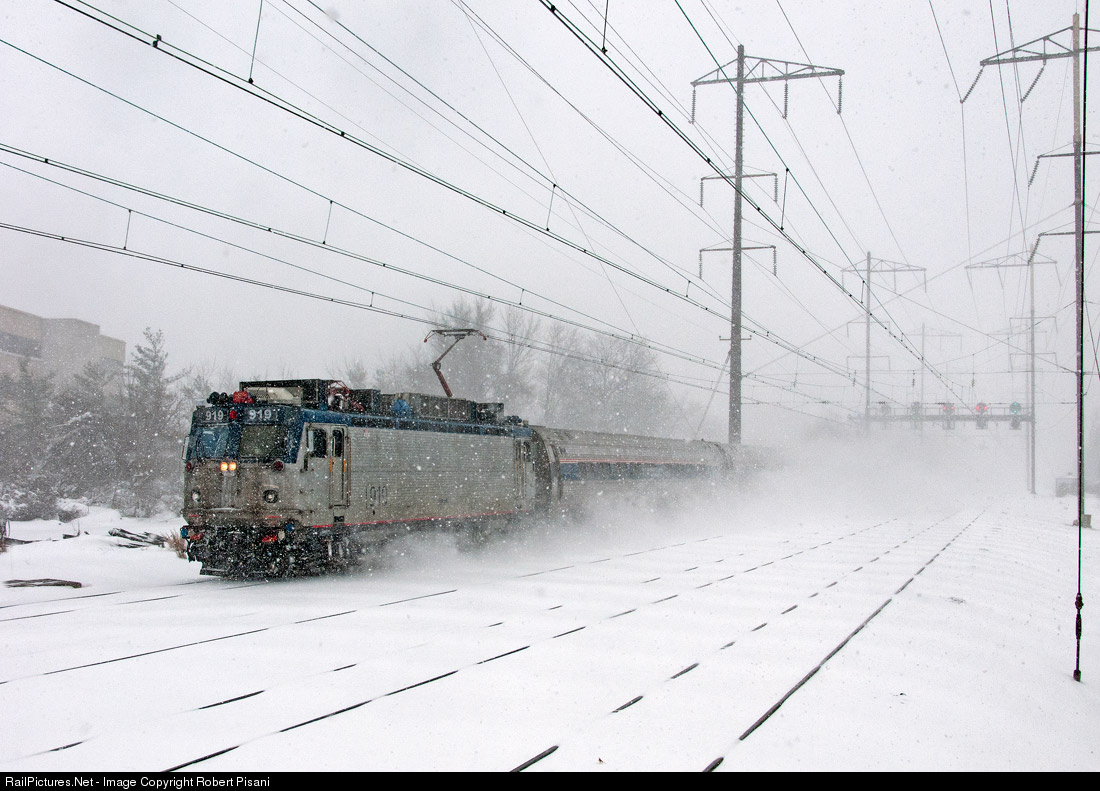 This will probably be the last winter season for the dwindling fleet of AEM-7s on Amtrak's roster. So it was very nice to see 919 leading Northeast Regional train 195 through the heart of a major winter storm. In this view 195 was running only a few minutes late, but the train would eventually arrive in Washington, DC about an hour and a half late. This is not bad considering the blizzard conditions that were encountered during most of the trip. Heavy winds caused the ripples of drifting snow that can be seen across all four tracks at this location. |