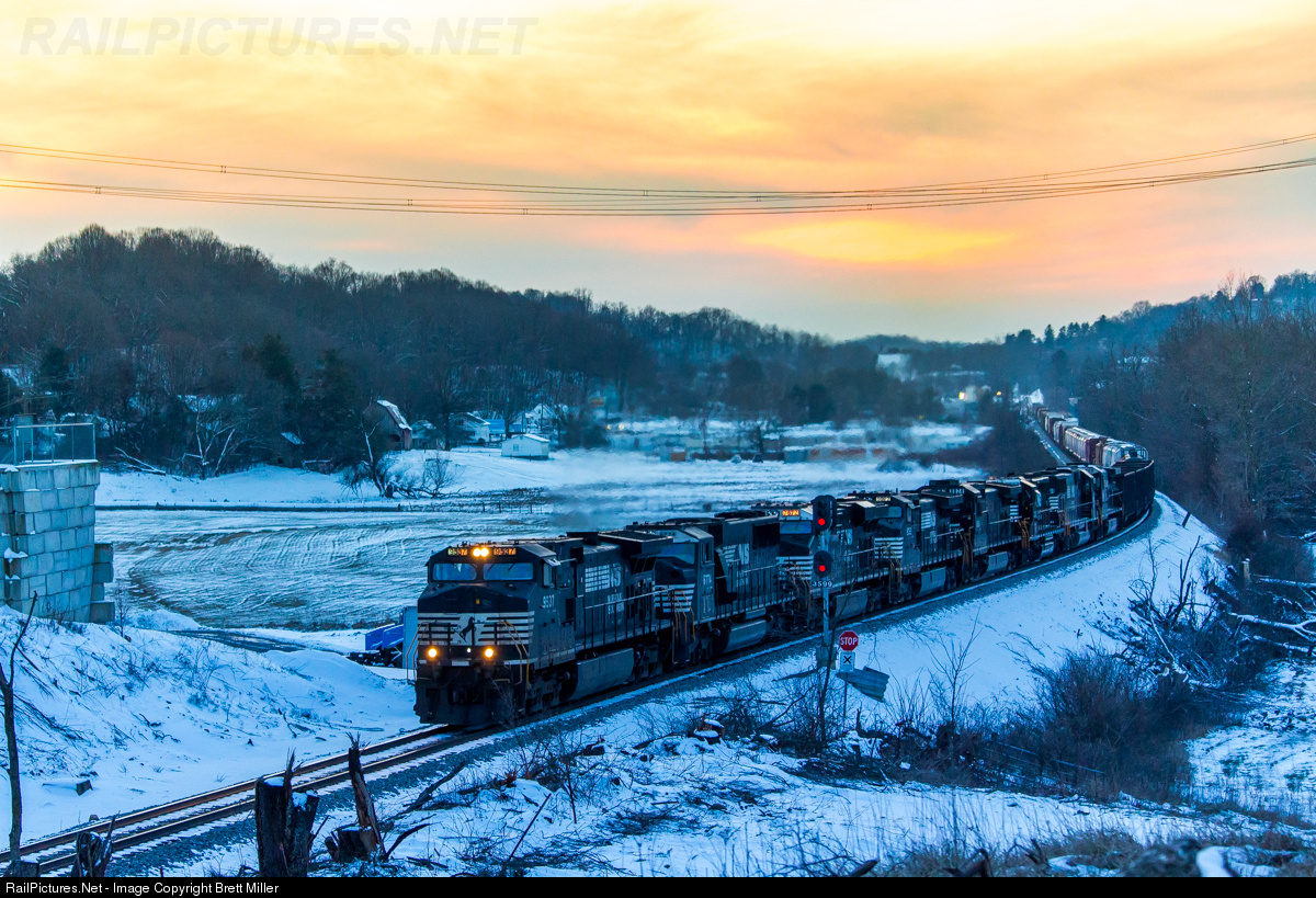 As the sun sets in the west and drops below the horizon the light fades to blue just in time for the eastbound 38Q. Here, eight thoroughbreds pull the train up the grade and by the signal at Mt. Carmel and continue east on a crisp winter night.