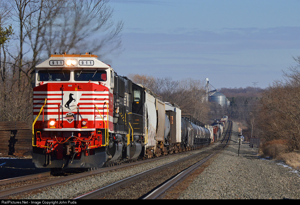 | NS 911 leads Conway, PA to Bellevue, OH freight train 15K west as it climbs out of the "sag" just east of Beloit on a sunny winter day. |