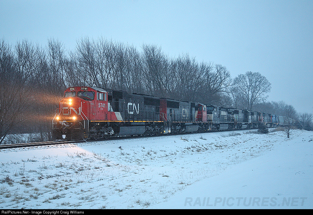 M337 was running about 12 hours late today. Here the train stops outside of Waterloo for a crew change as the snow falls. There has been alot of power coming to Iowa over the weekend for the busy unit train week ahead. Today's M337 has an interesting lashup of CN 5741, CN 5640, NS 9458, NS 6963 (Go Rail), CN 5654, BCOL 4652, GTW 4927.