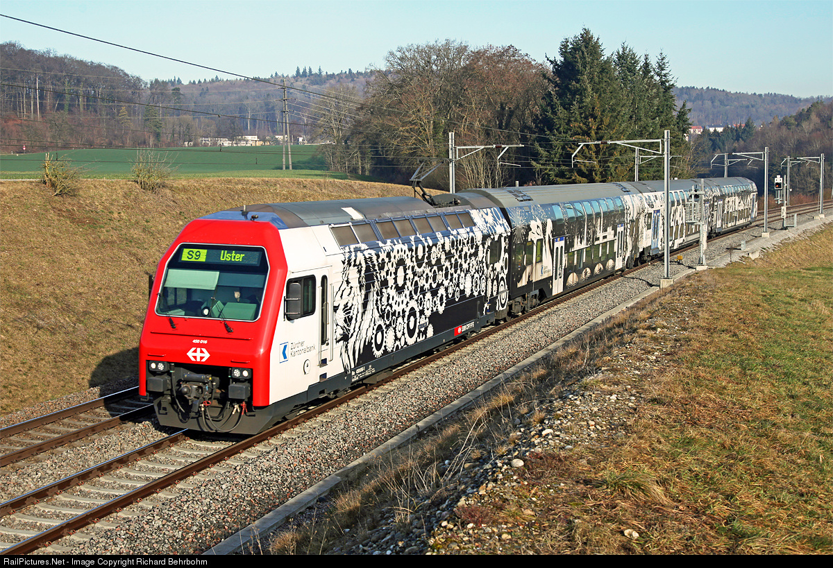 | Since july 2013, this double deck commuter trainset (DPZ) of the S-Bahn Zürich is decorated for the ZKB (Zürcher Kantonalbank). |