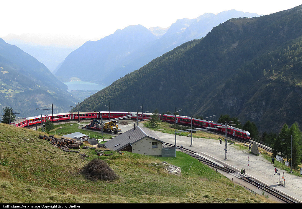 | Regio from St. Moritz toward Tirano runs through the horseshoe curve at the station Alp Grüm (2091m asl). In the background the Lago di Poschiavo (962m asl). In about 50 minutes this train will run along this lake |