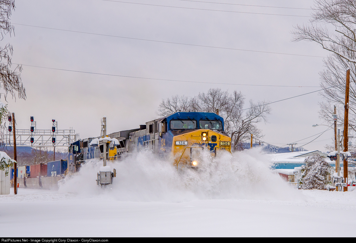 Dashing through the Snow CSXT 143 makes a scene as it crosses one of grade crossing in St. Albans, WV on day two of Winter Storm Jonas. Only priority freights were running on this day, with a 25 mph speed limit through all crossings. |