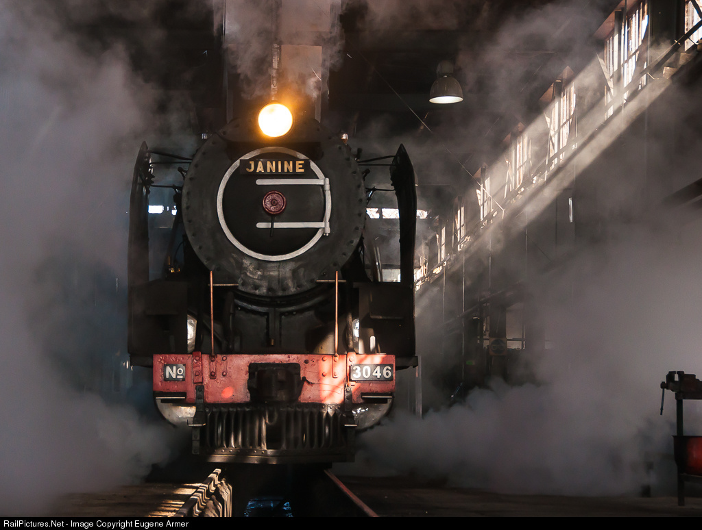 A shaft of sunlight catches class 15F 4-8-2 no.3046 inside one of the shed buildings at the old Germiston loco depot, home of the Reefsteamers preservation club.