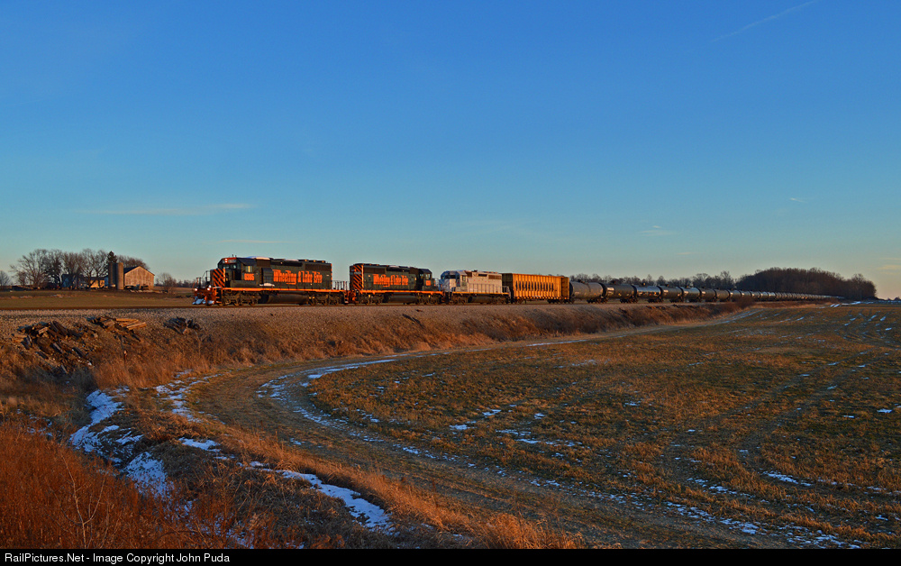 The last rays of sun shine on a trio of Wheeling and Lake Erie locomotives as they lead a westbound freight just outside of Smithville.