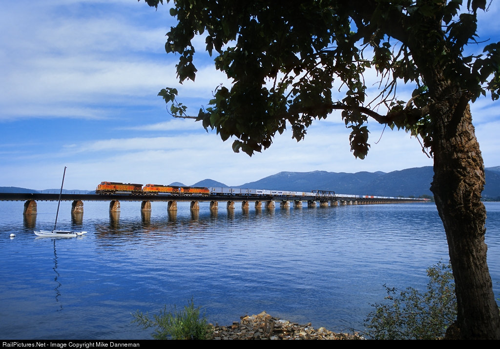 A westbound BNSF Z train crosses the bridge over Lake Pend Oreille at Sandpoint, Idaho, on June 29, 2006.