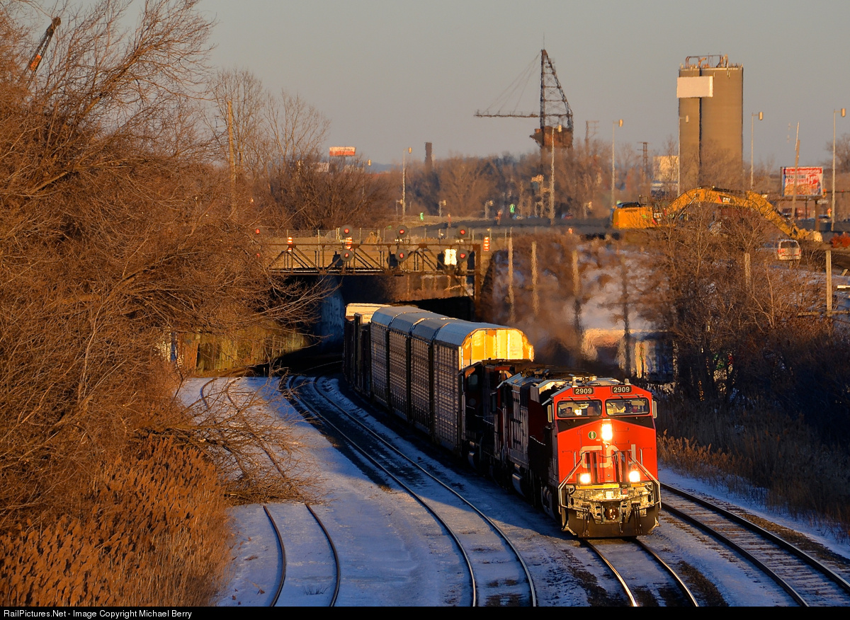 | Under a soon to be demolished tunnel. CN 401 is exiting from a tunnel that will be demolished shortly as part of infrastructure projects in the area with CN 2909 leading. It's about 25 minutes before sunset and the lead unit is bathed in some great winter light. |