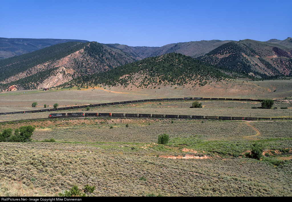 A Southern Pacific coal train climbs through the Crater Loops at Crater, Colorado, on the Craig Branch on the morning of July 31, 1996. Five General Electric AC4400CWs power the train, with two on the point, two mid-train, and one following up on the rear of the train. In this view Nos. 368 and 287 are just entering the upper loop, while Nos. 332 and 256 on are seen below on the lower loop. The track continues through a cut barely visible in the foreground. In the background on the far right is the grade going through Volcano, where the train will be in another five track-miles or so.