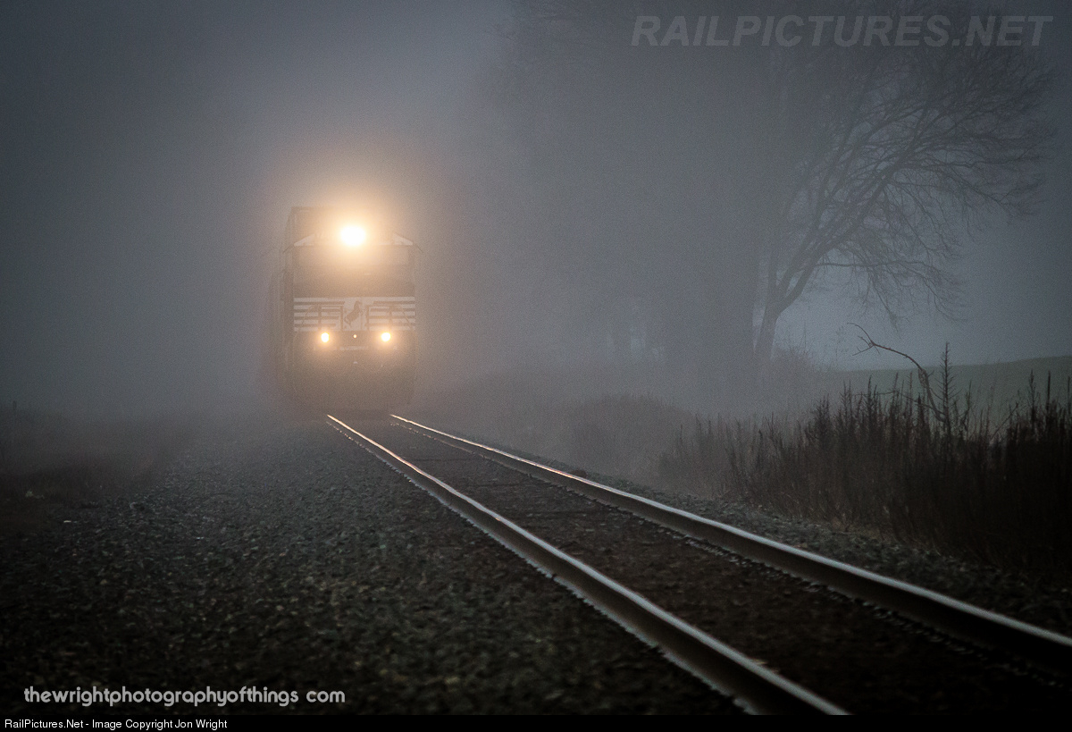 Intermodal train 203 passes the Mason Dixon Line in early January, 2016 in fog which has settled in the Cumberland Valley.