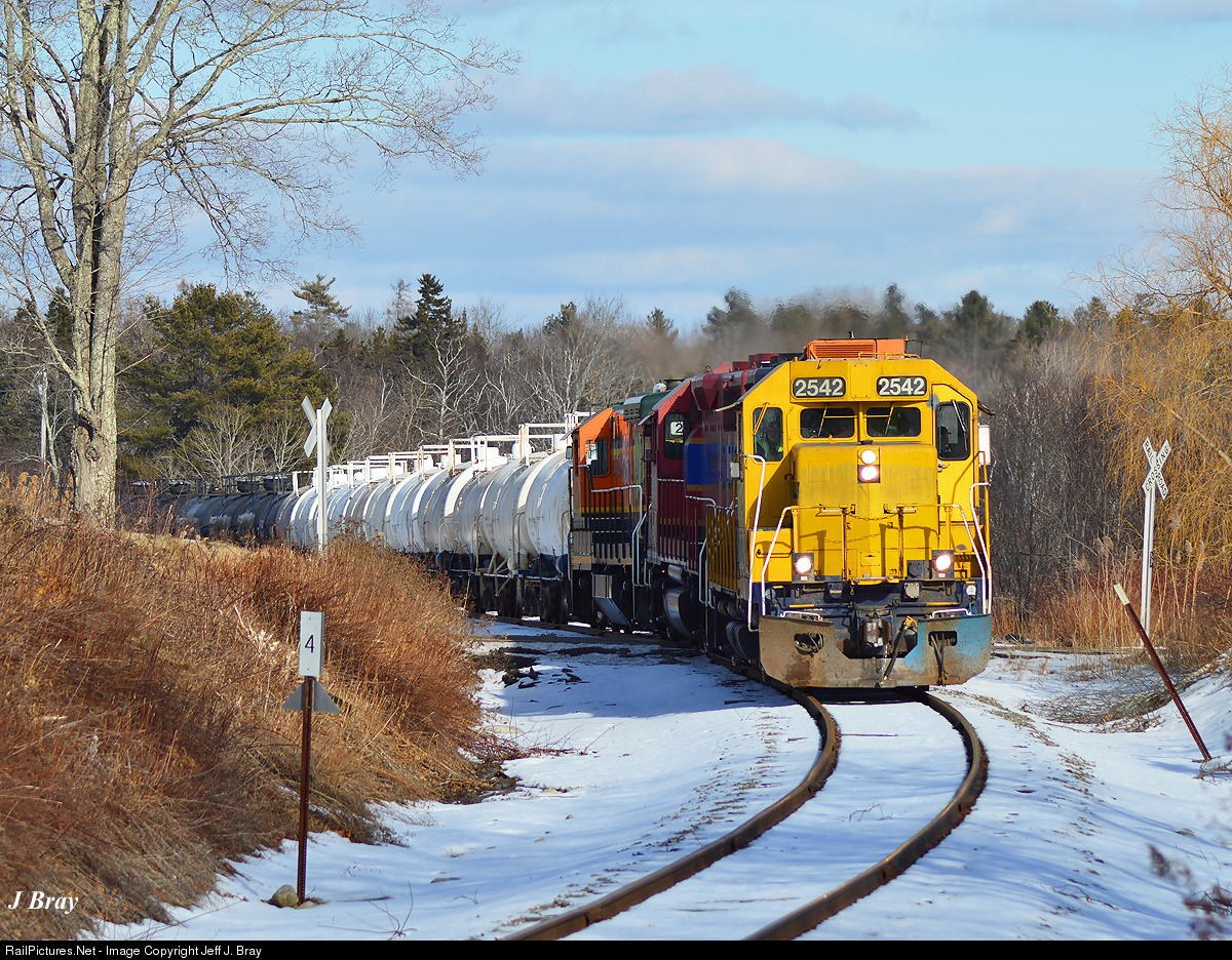 Central Maine & Quebec's southbound #211 had found some rays by the time it reached the lower end of the Searsport Branch on January 30, 2016. When the trip first began out of Hermon over an hour before, dark overcast conditions looked to be what we'd face all the way. Having just crossed School Street in Stockton Springs, Maine, old rag-tagged 2542 gladly soaked up the sun four miles from it's destination of Searsport.