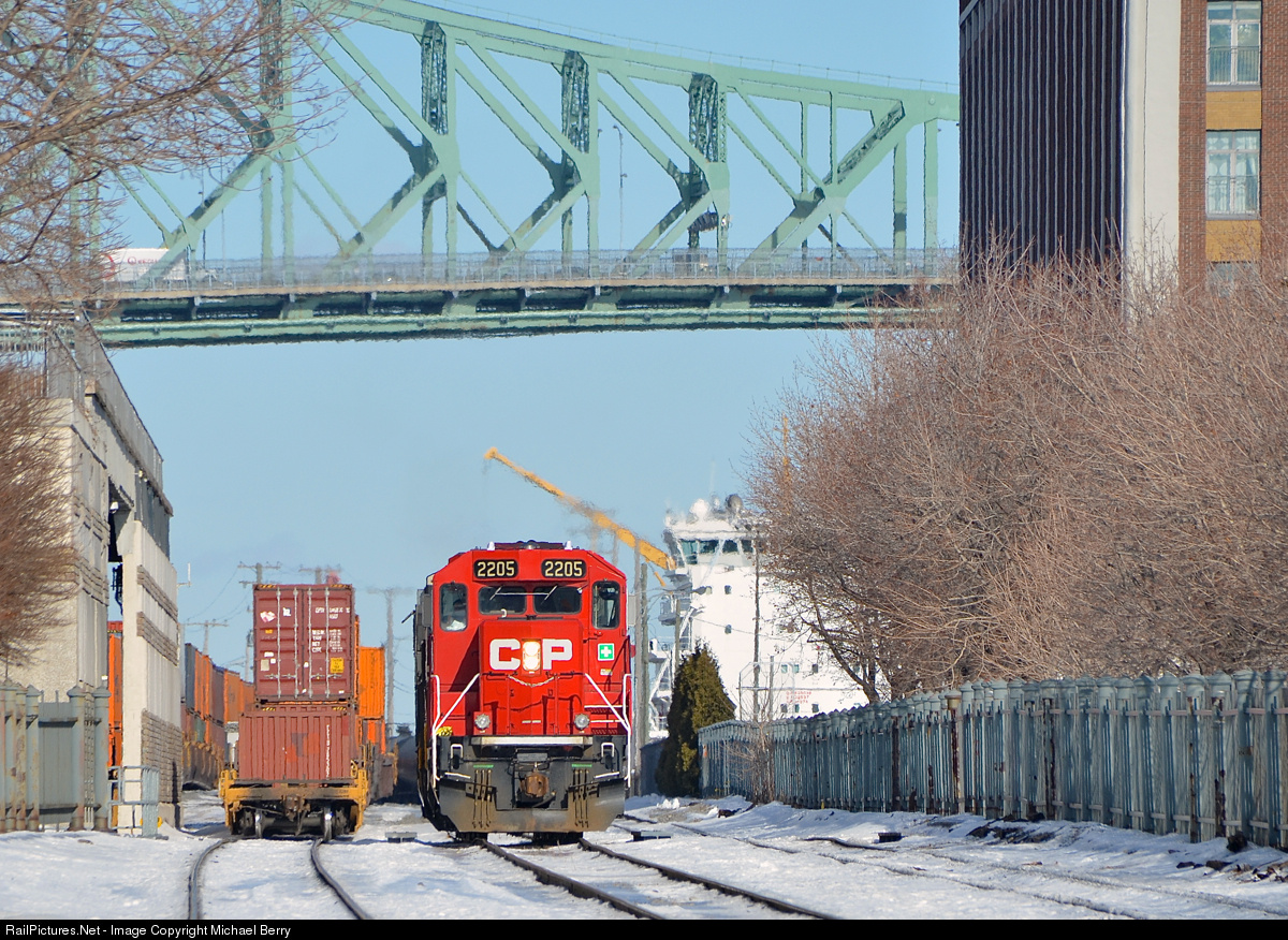 | Trains and a ship. CP 142 with an unusual GP20C-ECO leader and two NS units trailing (CP 2205, NS 8362 & NS 2693) is light power in the Port of Montreal after dropping off its train. It is backing up light on its way to St-Luc Yard. At right is a ship berthed in the port. |