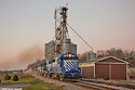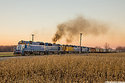 | As the sun begins to settle below the horizon, the GLC OSTN throttles up and the venerable GP35's that ride on Alco trucks feel as though they have to smoke like Alcos with an Osmer bound with a 90 car grain train. It sure is hard to beat a Michigan farm country summer sunset. |