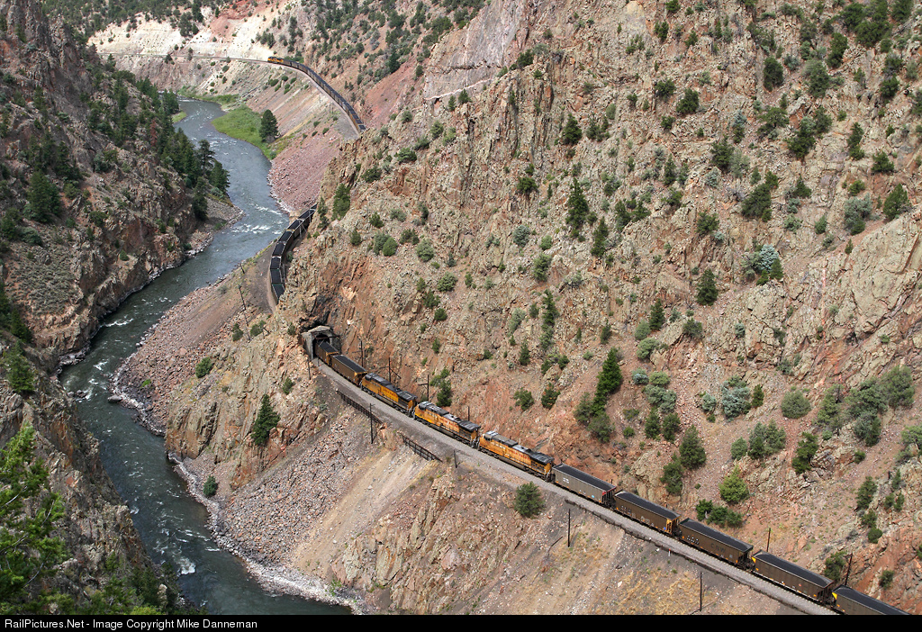 Snaking along the Colorado River, the DPUs of an eastbound Union Pacific coal train are seen in scenic Little Gore Canyon east of Azure, Colorado, on August 21, 2014. Three GE AC4400CWs operating as a mid-train DPU are exiting Tunnel 40, while a lone EMD SD70ACe holds down the rear of the train.