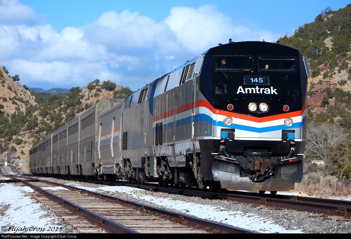 Having just descended Glorieta Pass, Amtrak's Southwest Chief #3 traverses Canyoncito, NM on this beautifully crisp Christmas day. Decorated in the Phase III paint scheme, this train features Heritage unit #145 as the lead locomotive.