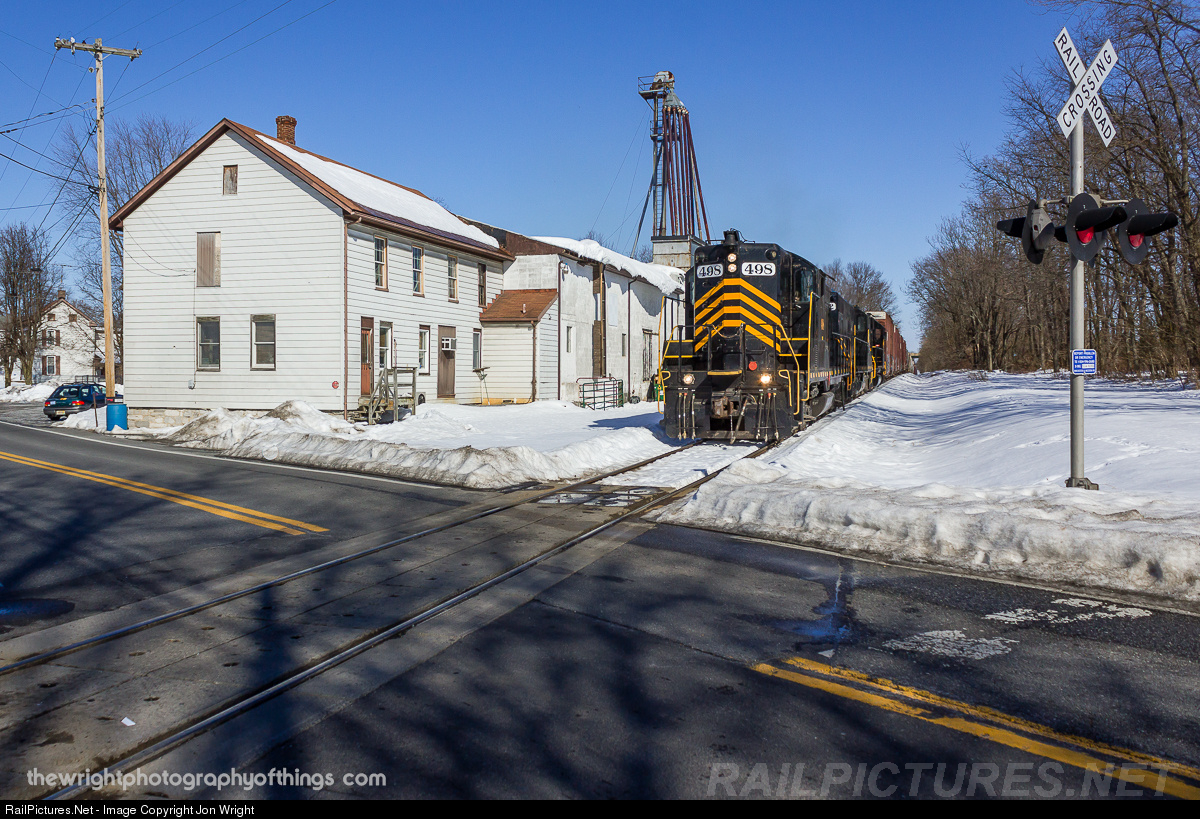HIGH HOOD GP9 498 LEADS GP10 752 AND GP38 2197 BY GOWER'S FEED MILL ON THE FORMER CVRR/PRR/PC/CR ROUTE SOUTH OUT OF HAGERSTOWN. 2016 MARKS THE RAILROADS 30TH ANNIVERSARY OF ACQUIRING THIS LINE AND IT'S NJ DIVISION TRACKAGE FROM CONRAIL.