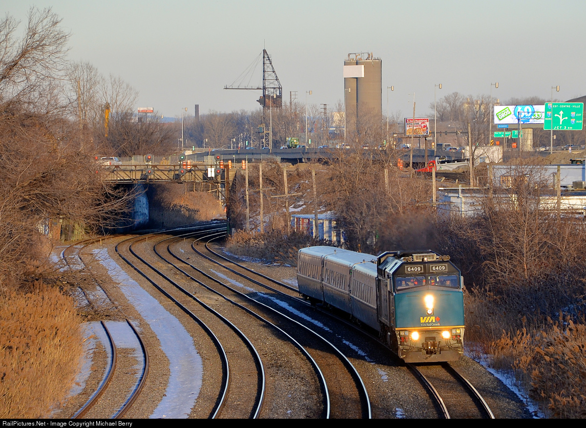 | A scene that will soon change. A lot of infrastructure work is going on in Montreal West near CN's Montreal sub. The short tunnel that VIA 59 is exiting will soon be demolished and I am unsure if the signal bridge will remain. Here VIA 59 led by VIA 6409 passes the venerable signals with three LRC cars trailing. The signal over the north track is lit for CN 394 which is close by. |